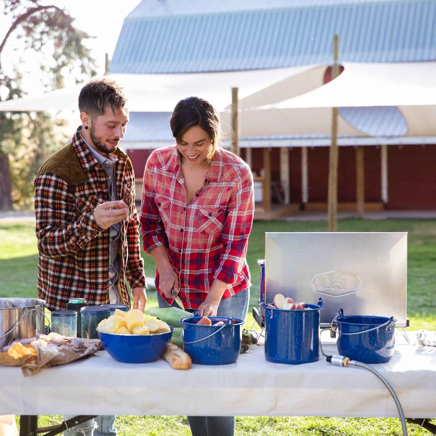 Built from heavy-gauge steel with a classic speckled enamel finish, the kettle was kiln-hardened twice at over 1000 degrees F to stand up to scratches and chipping. The three-ply construction maximizes heat distribution for even cooking.