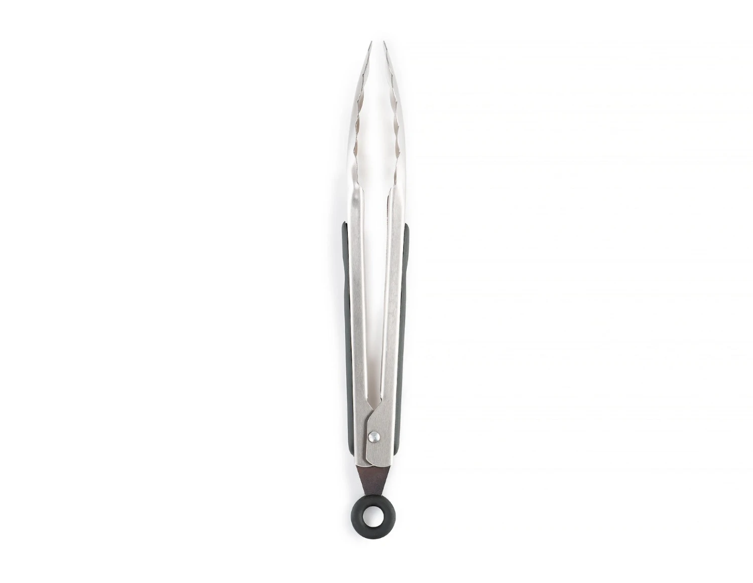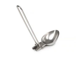 The tri-position spoon-ladle’s handle folds over to allow for compact storage, or folds out to a ladle or a spoon. The dual position spatula handle also folds over for compact storage or out into a large bladed spatula.