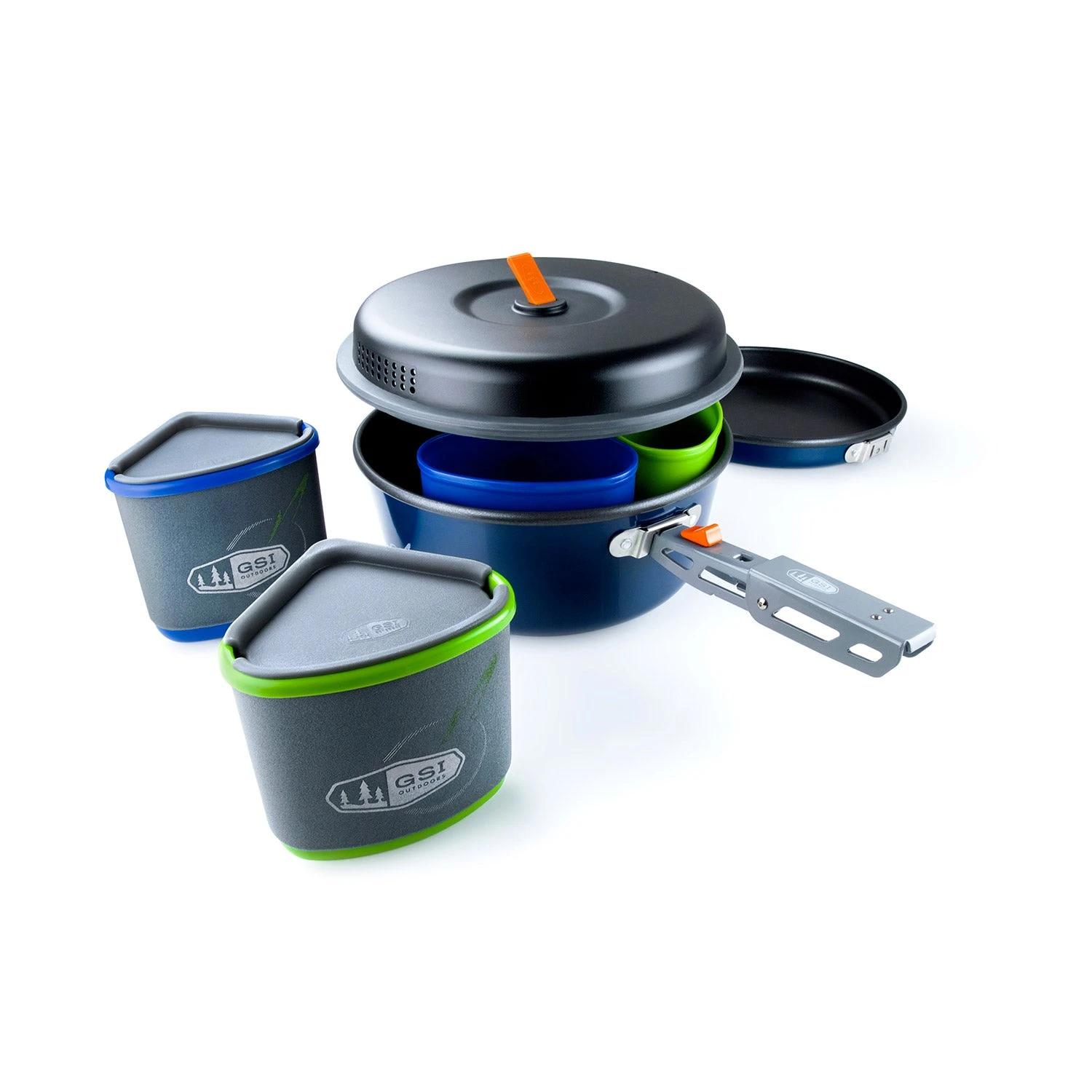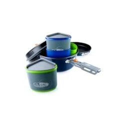 A compact and versatile cook set for backpacking, the Bugaboo Backpacker offers premium performance at an exceptional value. This set includes 2 mugs with insulating sleeves and sip-it tops, and 2 nesting bowls with graduations ingeniously designed to fit into a 2 liter pot with strainer lid. Also included in the kit is a pot grabber, a fry pan and a large carrying bag which doubles as a kitchen sink.