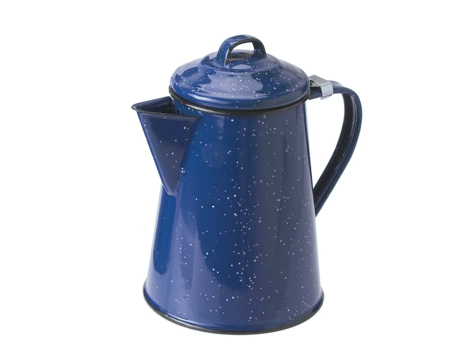 A coffee maker for campsite, cabin or even a retro farmhouse kitchen, this handsome GSI Outdoors Enamelware Coffee Pot brews great-tasting, old-fashioned coffee or tea.Built from heavy-gauge steel with a classic speckled enamel finish, every piece has been kiln-hardened twice at 1000 degrees F to stand up to scratches and chipping. The three-ply construction maximizes heat distribution for even cooking.