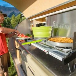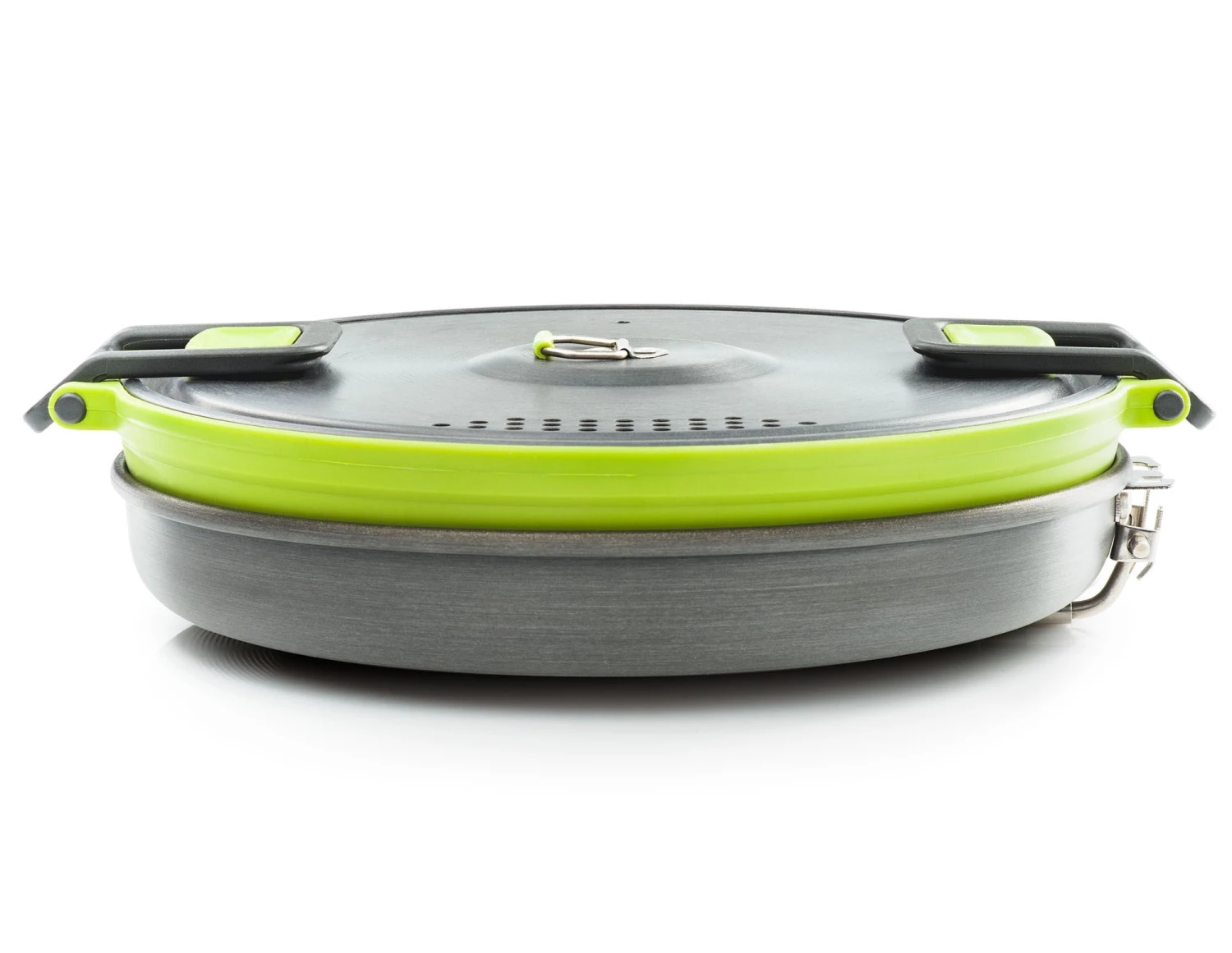 The frypan has a non-stick coating that reduces mess and fuss, and an efficient even-heating design, and everything nests together in a compact storage bag.
