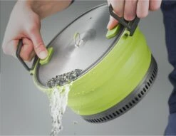 The lid doubles as a strainer and has silicone pads at its grip points to help avoid burns. Graduations molded into the silicone pot body make measuring easy, dual handles make handling easy and fold out of the way for travel.