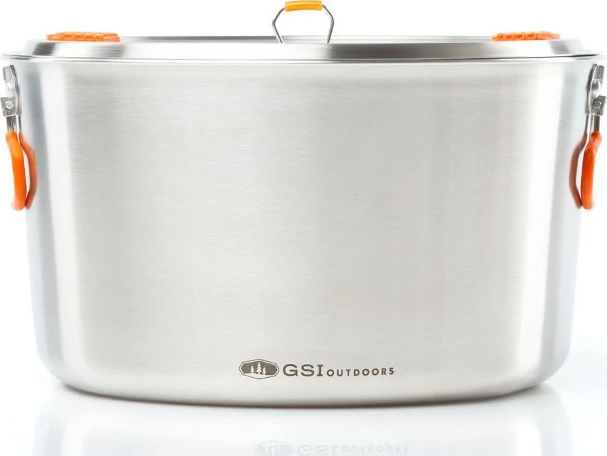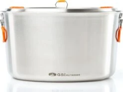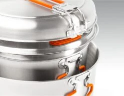 Our Big Kahuna stainless steel base camp set is built strong, heats efficiently and evenly, and handles meals for four – or more – people. Tough enough for cooking over open flame or red-hot coals, the 5L pot makes tons of pasta, the 3L pot handles cooks up a bunch of soup or stew, and the big frying pan wrangles big breakfasts. Strainer Lids make draining safe and easy, and dual bail handles on the pots give you sure, secure hold. And – since it’s all stainless steel – it handles years of abuse, cooks evenly and efficiently, and cleans up easily. Plus, it all nests into a mesh stuff sack for low-footprint travel.
