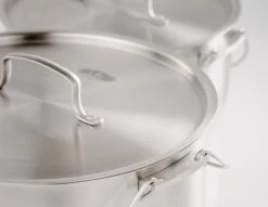 What do you get? A massive 8.5L pot and giant 5L pot with lids, and a jumbo 10” fry pan. To make hanging and filling and pouring easier, the pots have dual handles that lock in place and out of the way.