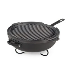 This innovative cast iron hub allows you to cook anywhere in a variety of configurations, including a 10″ deep frypan with dome lid, dual-sided cast iron griddle, grill pan, removable handles, and insulated pan handle sleeve.