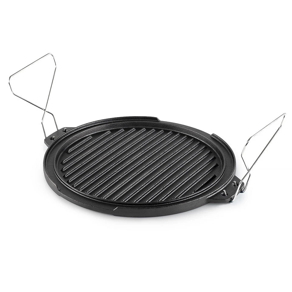 Dual-sided, pre-seasoned cast iron griddle / grill integrates for use with other Guidecast products. Wire handles allow safe handing.