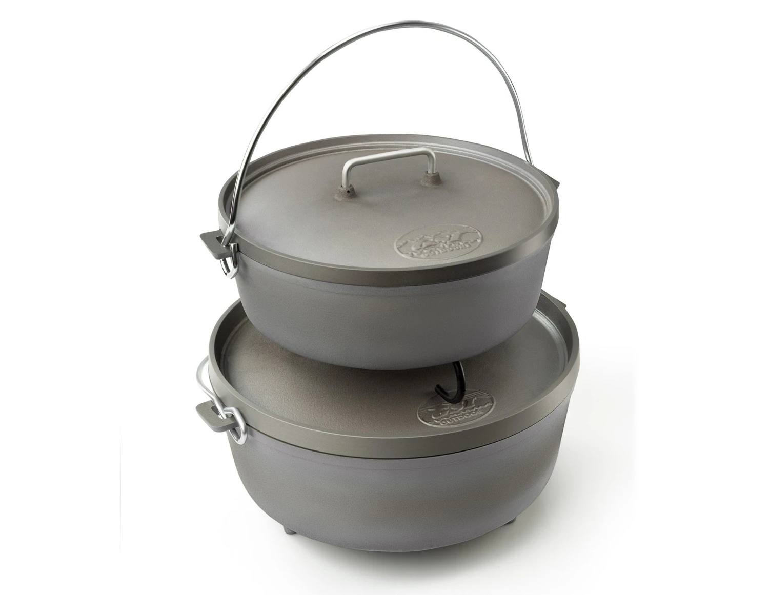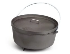 The GSI Outdoors Dutch oven comes in three sizes, ten-, twelve-, and fourteen-inch. The ten-inch has no legs allowing it to nest in the larger ovens, while two larger sizes have three fixed legs to support them over the coals.
