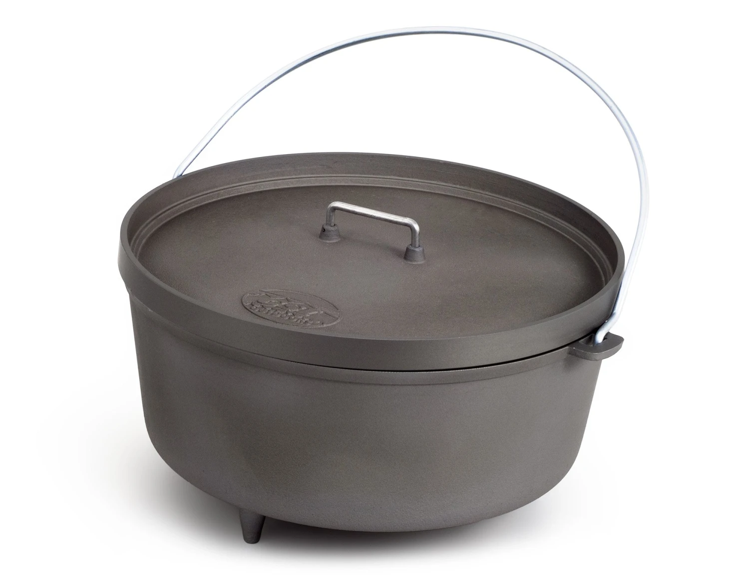Dutch ovens cook with radiant heat, so they work best with charcoal or coals underneath as well as heaped on the lid. (They cook beautifully in your oven at home, too.) This lid has a lipped edge to hold coals in a ring.