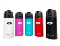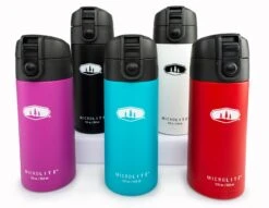 Stainless steel makes it rugged and pure, the vacuum-insulation keeps hot drinks hot for 12 hours and cold drinks cold for 24, and the insanely thin 2mm walls keep the profile trim enough for cupholders and other tight spaces. The cap is amazing. Lock it tight for travel, then push a button and it flips up for easy drinking.
