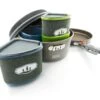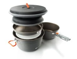These durable, non-stick coated, hard anodized aluminum pots are the ultimate in design, space efficiency and cooking performance. Every set includes a 2 pots, a frypan, 2 nylon strainer lids, a cutting board for a variety of prep duties, a folding pot handle, and a welded stuff sack to keep everything organized and doubles as a sink for washing.