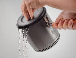 The pot strainer lid makes draining easy, and the whole system fits into a carry bag that doubles as a camp sink.