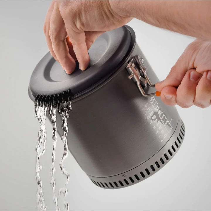 Built for maximum cooking efficiency, and designed to carry light and pack small, this is our highest performance two-person backpacking system and stove. The rugged, hard-anodized aluminum 1.8L boiler is coated with durable, scratch-resistant PFOA-free Teflon® with Radiance Technology for superior non-stick performance, easy cleaning, and outstanding heat transfer. Then we added our hyper-conducting heatsink to speed cook times by 30% so you save fuel and time. The kit also includes all your eating gear and canister stove. Nesting perfectly into the pot with room for your fuel canister are two 20oz wide-mouth mugs with insulated sleeves and Sip-It lids, two 20 oz bowls, and a couple of Foons our folding spork and our Pinnacle Canister Top 10,000 BTU Stove. The pot strainer lid makes draining easy, and the whole system fits into a carry bag that doubles as a camp sink.