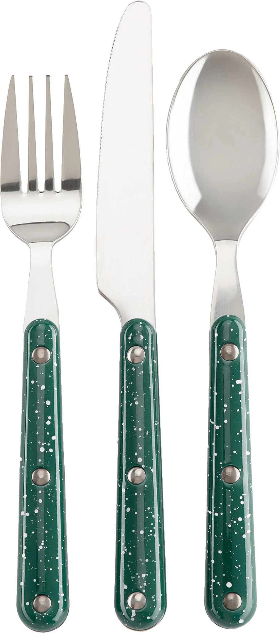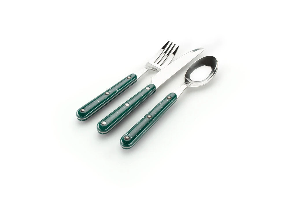 From campsite to cabin to farmhouse kitchen, the enamelware collection blends classic style with rugged durability. The GSI Outdoors dinnerware collection is suited for both indoor and outdoor use. Includes 4 flatware place settings; 4 tablespoons, 4 forks, 4 knives.Sure, it might look a little old fashioned, but we like to think of our Pioneer Cutlery Set as epitomizing classical beauty. Perfection takes time and with its heavy-gauge, full tang, stainless steel construction and speckled finish that perfectly complements the full line of GSI Outdoors Enamelware, these pieces will maintain their beauty for years to come.