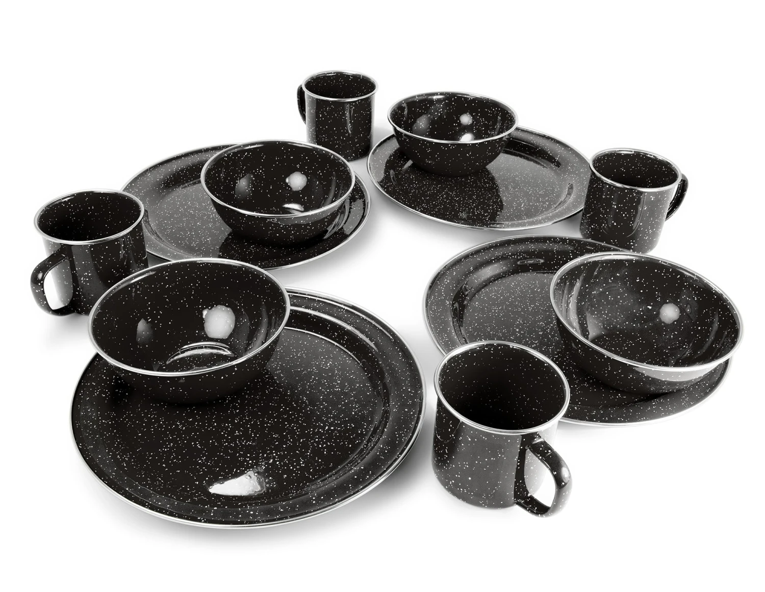 Made from heavy-gauge steel, these pieces have been twice kiln-hardened to over 1000 degrees F for superior durability, with a cheerful porcelain glaze and stainless steel rim for added strength.The four 12-ounce cups, four 10.375-inch plates and four 5.75-inch bowls stand up to heavy use at base camp and make a cheerful addition to the everyday table as well.