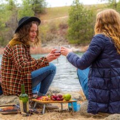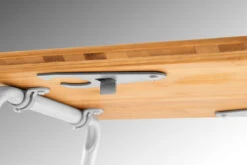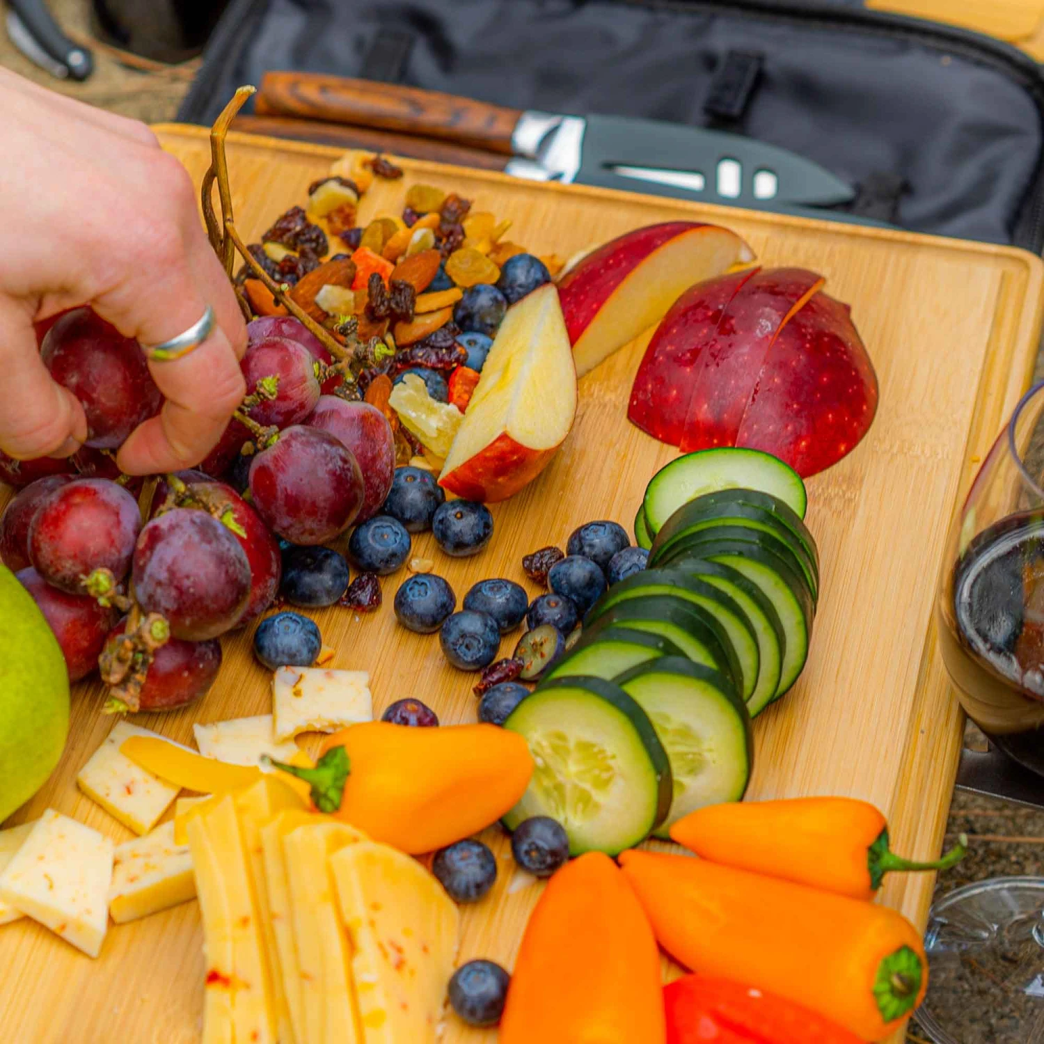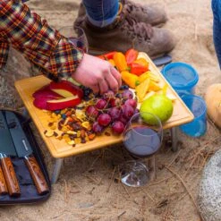 Compact bamboo top picnic table with folding legs and convenient wine glass holders that prevent spills and provide for an uncluttered table surface.