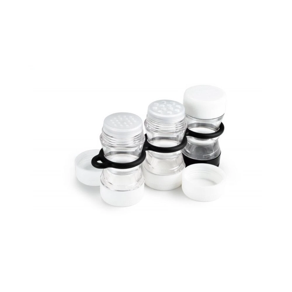 Ultralight set conveniently links up spice containers providing up to 6 different spice options with removable screens for easy refilling.
